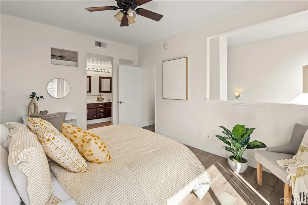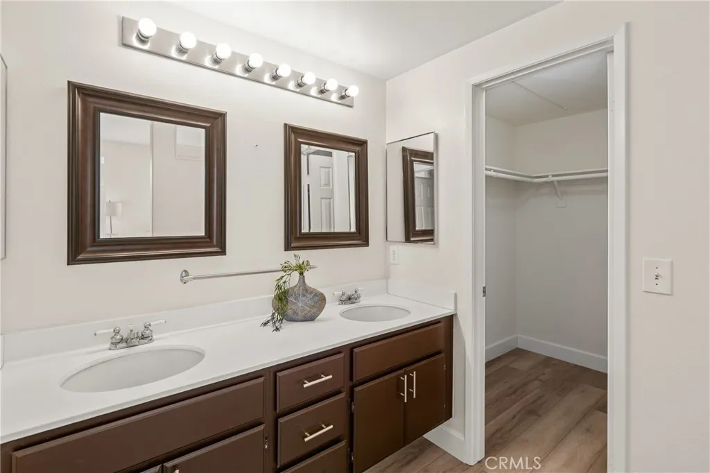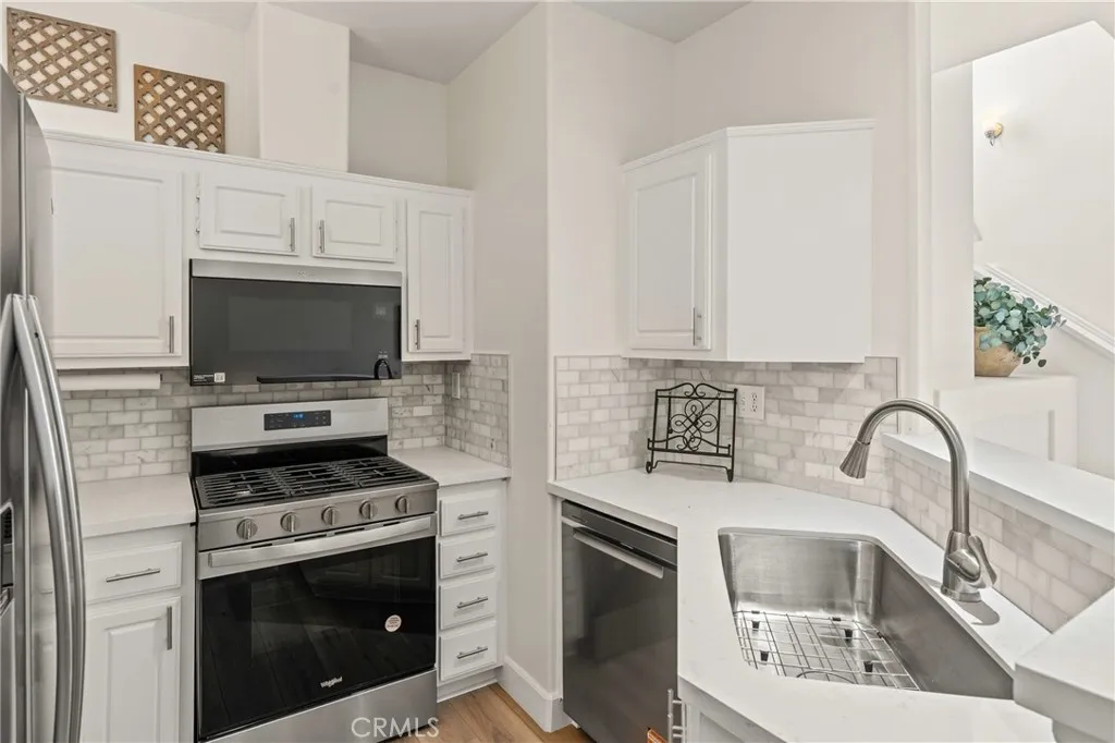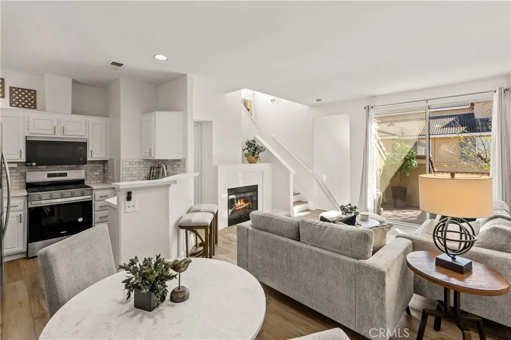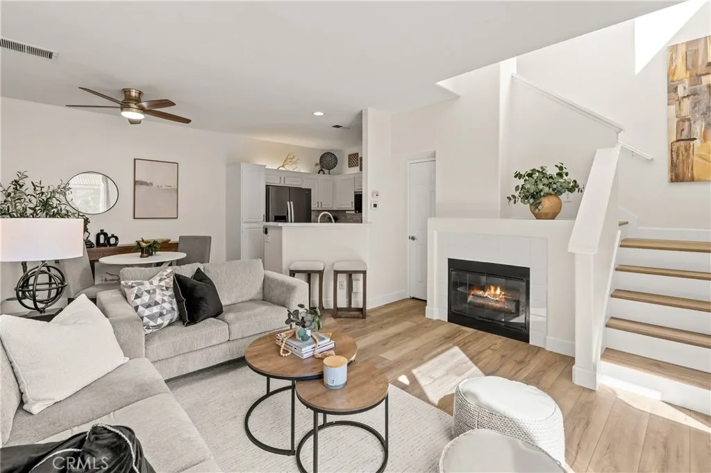 Welcome to this charming 1 bedroom 1.5 bath condo nestled in the highly sought after Monaco community in Anaheim Hills! Spanning 865 Square Feet, this home offers a perfect blend of comfort and convenience. Step inside and enjoy the spacious living room with gas fireplace and sliding doors that lead you to your own private balcony for outdoor entertaing and relaxing. The interior has recently undergone lovely upgrades including wood plank vinyl flooring. The kitchen boasts new appliances,5 burner gas stove, newer stainless sink and quartz countertops. Step upstairs to your peaceful bedroom offering ensuite bath with double sinks and fabulous walk-in closet. This condo also features a unique advantage - an attached 2 car tandem garage + a driveway large enough to park an SUV, providing ample parking space for visiting friends or additional storage needs. Residents of Monaco community are spoiled with resort-style amenities including sparkling swimming pool, 3 spas, tennis courts, gym, club house and more. Perfectly located near top rated schools, parks, shopping and dining plentiful options, this condo ensures you experience all that Anaheim Hills has to offer while enjoying tranquility within your own retreat. Don't miss out on making this delightful condo your home.